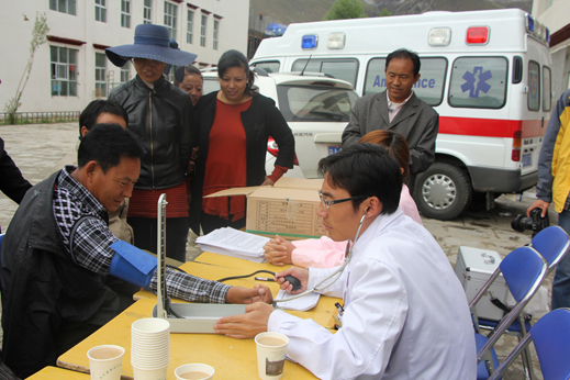 通過(guò)為尼木縣鄉(xiāng)村小學(xué)老師們的體檢,董發(fā)善醫(yī)生說(shuō):“大部分老師都患有血管神經(jīng)性頭疼和不同程度的胃病和膽囊疾病。這是由于在鄉(xiāng)村學(xué)校中,老師們工作繁忙,經(jīng)常忘記吃飯或者到了吃飯的時(shí)候就湊合吃幾片風(fēng)干肉,喝幾杯酥油茶。這是造成鄉(xiāng)村老師腸胃和膽囊疾病的原因。此外,由于老師們經(jīng)常站著講課,腰椎疾病的患病率比其他行業(yè)的要高。”在體檢的同時(shí),醫(yī)護(hù)人員還向老師們發(fā)放了常見(jiàn)疾病預(yù)防知識(shí)的宣傳材料。