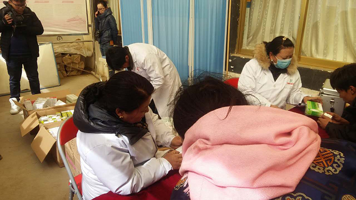 義診活動(dòng)在下午三點(diǎn)半開(kāi)始,前來(lái)就診咨詢(xún)的群眾絡(luò)繹不絕。醫(yī)務(wù)人員在為患病群眾把脈號(hào)診、開(kāi)處方的同時(shí),結(jié)合那曲縣羅瑪鎮(zhèn)群眾常見(jiàn)病、多發(fā)病及高海拔地區(qū)的氣候特點(diǎn),給當(dāng)?shù)厝罕娞岢隽巳粘I铒嬍辰ㄗh,在疾病預(yù)防、降低常見(jiàn)病發(fā)病率方面提供生活指南。義診期間,醫(yī)療服務(wù)小分隊(duì)醫(yī)務(wù)人員加班加點(diǎn),共為羅瑪鎮(zhèn)的400余名群眾進(jìn)行了義診檢查,發(fā)放藥品價(jià)值2萬(wàn)余元,在為患病群眾解除病癥、減輕病痛的同時(shí),切實(shí)溫暖了廣大群眾的心。