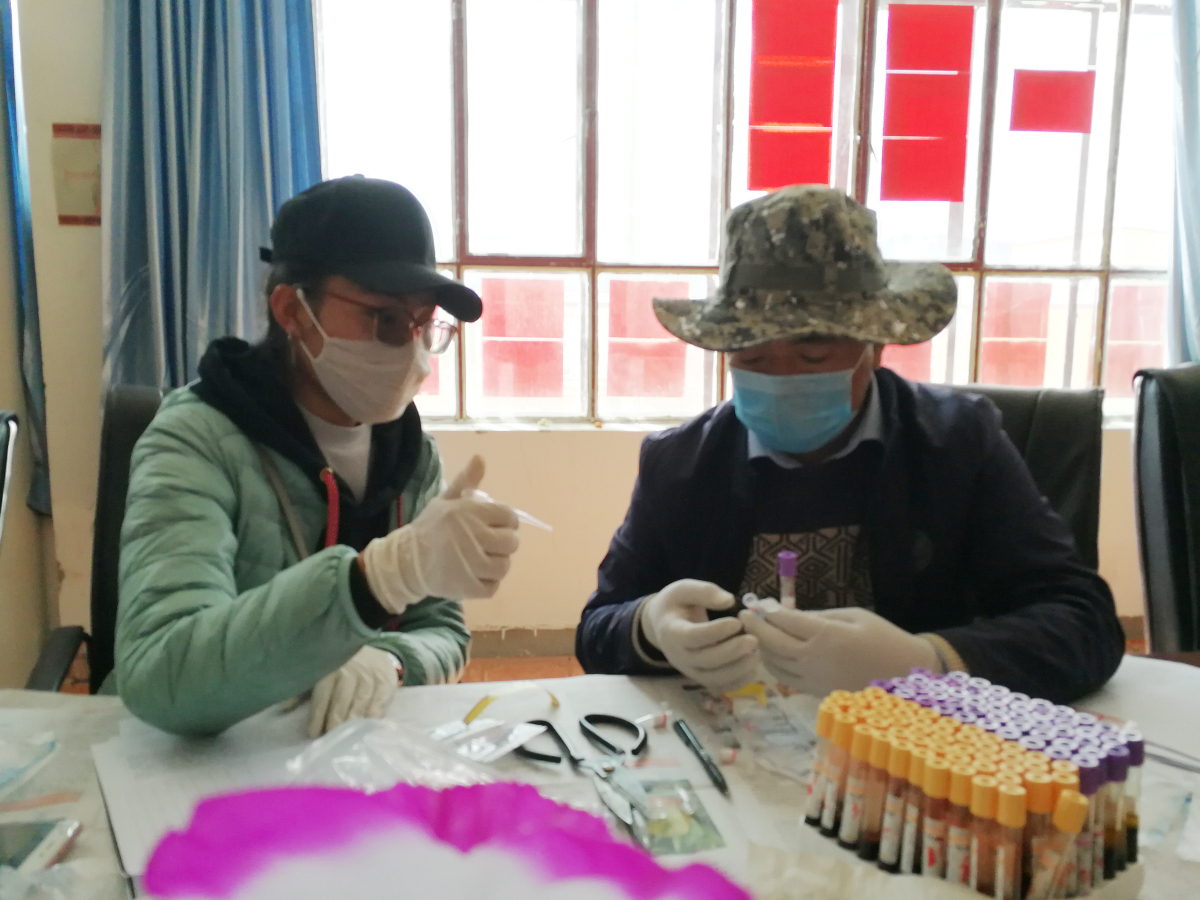 鐘義華、劉亞美、丁雪琴分到另一組,負(fù)責(zé)采血和血樣信息錄入工作。鐘義華是檢驗(yàn)士也是隊(duì)長(zhǎng),更是我們醫(yī)療隊(duì)唯一的男孩子,重活、粗活全包,還要負(fù)責(zé)隊(duì)員的工作安排,以及與政府領(lǐng)導(dǎo)、工作人員的溝通協(xié)調(diào),除此之外,他還要負(fù)責(zé)血樣采集、包蟲(chóng)病防治的宣傳。