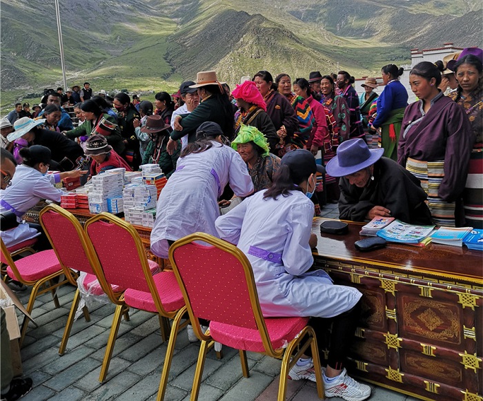 當(dāng)天上午,全國(guó)婦聯(lián)宣傳部、自治區(qū)婦聯(lián)、拉薩市婦聯(lián)、那曲市婦聯(lián)一行來(lái)到安置點(diǎn)為群眾贈(zèng)送了藏漢雙語(yǔ)書籍。阜康義診工作隊(duì)也來(lái)到現(xiàn)場(chǎng)為安置點(diǎn)居民量血壓、檢查病情并詢問(wèn)身體情況,耐心細(xì)致地為群眾分析病情、講解日常衛(wèi)生保健、合理用藥等衛(wèi)生常識(shí),認(rèn)真解答關(guān)于常見(jiàn)病、多發(fā)病的預(yù)防診治及愈后注意事項(xiàng)。僅一個(gè)上午時(shí)間就為100余名安置點(diǎn)群眾開(kāi)展了問(wèn)診、聽(tīng)診、答疑、測(cè)血壓和健康知識(shí)宣傳,免費(fèi)發(fā)放各類藥品價(jià)值4萬(wàn)余元 。
