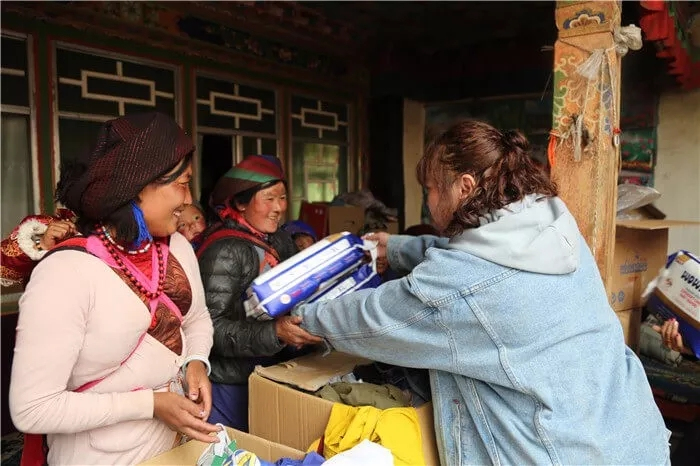 西藏阜康天使基金會副秘書長吉拉女士向村民贈送生活用品