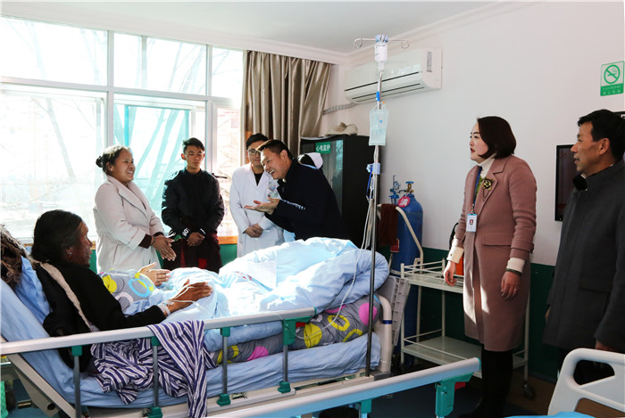 在藏歷新年和新春佳節(jié)來臨之際,2018年2月15日、16日,受公司黨委書記王斌同志委托,由公司黨委副書記、副總經(jīng)理陳彬同志,西藏阜康醫(yī)院院長阿旺建才、西藏阜康醫(yī)院院長歐珠羅布帶隊的雙節(jié)慰問小組集中慰問春節(jié)期間堅守在一線的專家、醫(yī)務(wù)工作人員、行政后勤員工及不能出院與家人團聚的患者。為他們送來了董事長的關(guān)心和問候,帶來了新年的美好祝愿和飽含暖暖情誼的慰問禮物。