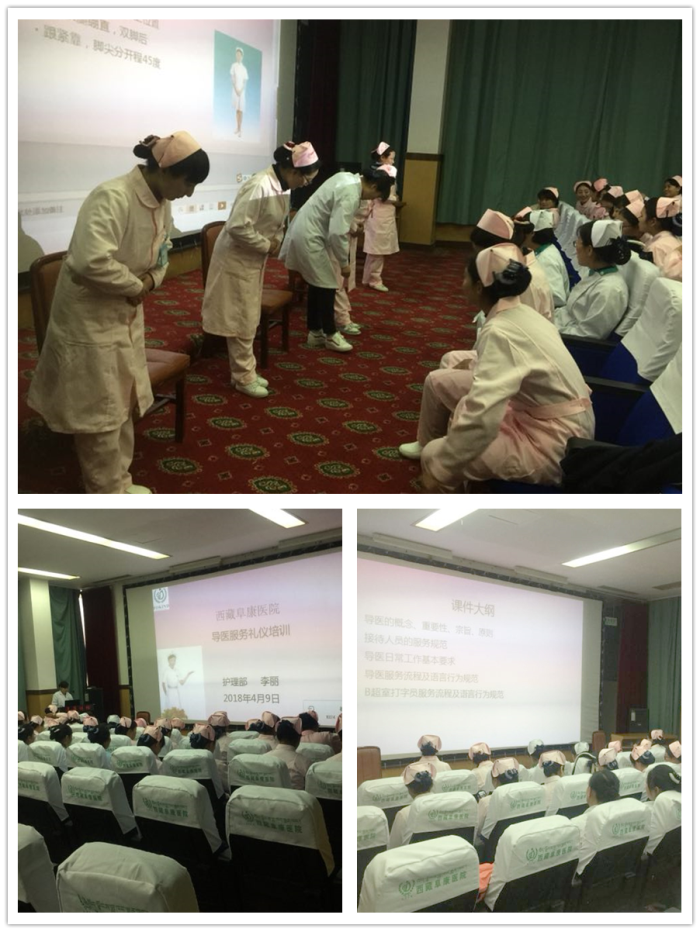 【概要】:2018年4月9日,西藏阜康醫(yī)院、西藏阜康醫(yī)院婦產(chǎn)兒童分院、西藏阜康醫(yī)院心腦血管分院三家醫(yī)院護理部組織開展了導醫(yī)服務禮儀培訓,培訓由護理部主任李麗主講并進行了現(xiàn)場指導與考核,旨在規(guī)范服務禮儀,提高服務質量。