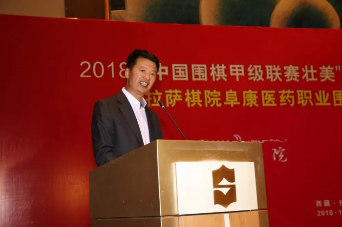 西藏自治區(qū)政府副主席甲熱·洛桑旦增代表自治區(qū)人民政府對各位嘉賓的到來表示熱烈歡迎。他說圍棋是一切棋類運動的鼻祖,是中華民族優(yōu)秀傳統(tǒng)文化的瑰寶,融合了軍事、哲學(xué)、詩詞等多種文藝形式,是中華民族幾千年來智慧的結(jié)晶,也是對人類文明的重要貢獻(xiàn)。在建設(shè)社會主義文化強(qiáng)國、體育強(qiáng)國、實現(xiàn)中華民族偉大復(fù)興的中國夢進(jìn)程中,圍棋這樣一項由文化融進(jìn)體育的智慧運動承擔(dān)著重要的歷史使命。拉薩棋院西藏阜康醫(yī)藥職業(yè)圍棋隊沖甲成功是西藏體育發(fā)展的重大突破,也是社會力量推動體育事業(yè)發(fā)展的典范。為此我代表自治區(qū)人民政府對西藏阜康醫(yī)藥職業(yè)圍棋隊沖甲成功表示熱烈祝賀,對社會各界支持西藏體育事業(yè)發(fā)展表示感謝,自治區(qū)政府將加快推進(jìn)體育事業(yè)改革、做強(qiáng)做大體育產(chǎn)業(yè),促進(jìn)全區(qū)體育事業(yè)再上臺階。祝愿2018年中國圍棋甲級聯(lián)賽壯美“第三極”西藏專場取得成功,祝愿西藏阜康醫(yī)藥職業(yè)圍棋隊在明年的甲級聯(lián)賽中取得更好成績。