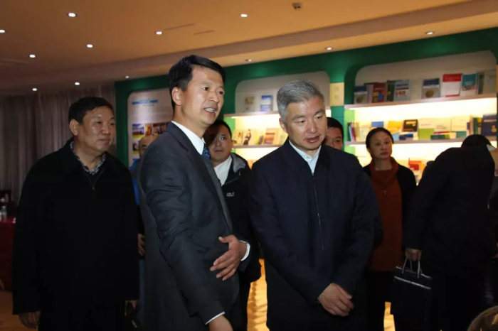 西藏阜康醫(yī)療股份有限公司黨委書記、董事長王斌向莊嚴(yán)書記介紹“阜康企業(yè)文化”