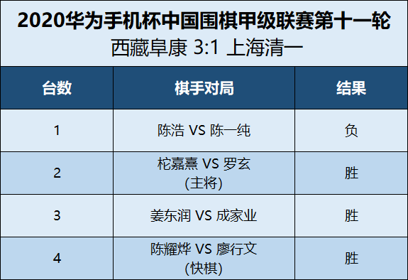 最終,西藏阜康隊獲得三場勝利,西藏阜康3:1勝上海清一。