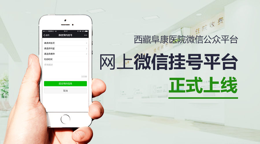 昨日,記者從西藏阜康醫(yī)院獲得好消息:5月24日,西藏阜康醫(yī)院微信公眾平臺(tái)網(wǎng)上預(yù)約掛號(hào)系統(tǒng)正式上線,可提供微信掛號(hào)、在線問(wèn)診、健康咨詢(xún)、新聞動(dòng)態(tài)等服務(wù)。