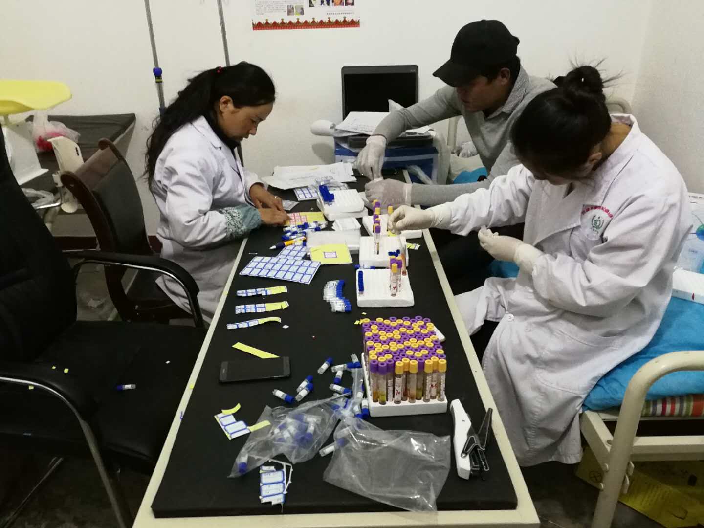 在篩查完夏瑪村牧業(yè)點(diǎn)后,醫(yī)療隊(duì)又迅速趕往鹽湖鄉(xiāng)。我們走進(jìn)鹽湖鄉(xiāng)衛(wèi)生院,隨處都能看到包蟲病防治知識(shí)張貼畫和宣傳欄。15、16日,在鹽湖鄉(xiāng)衛(wèi)生院篩查的工作量很大,每天篩查結(jié)束后,還要對(duì)當(dāng)天的血液進(jìn)行分離,醫(yī)療隊(duì)的隊(duì)員們一天工作下來已經(jīng)累得說不出話來,每天經(jīng)常是一早出門,工作到凌晨才回到住所。