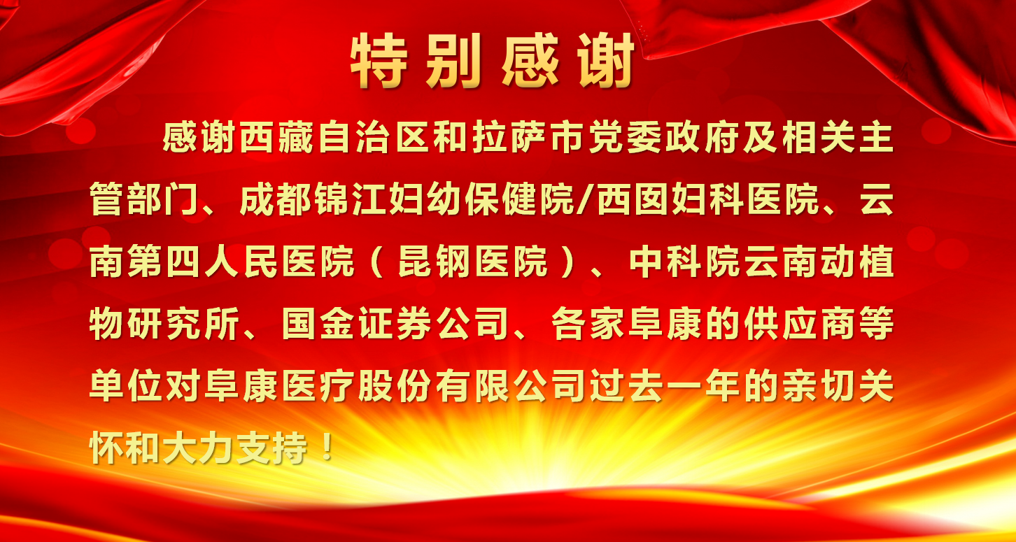我之存在,因?yàn)橛心?;百年阜康,感恩有您。感恩是一種態(tài)度、一種美德、一種情懷!不忘初心、砥礪前行,感謝你們的一路陪伴,阜康的輝煌離不開每一位阜康人的奉獻(xiàn),雄關(guān)漫道真如鐵,而今邁步重頭越!2018年將是阜康騰飛的一年,在各級(jí)領(lǐng)導(dǎo)關(guān)心下,各位同仁支持下,阜康一年更比一年好!以十九大精神為指導(dǎo),努力打造“團(tuán)結(jié)、創(chuàng)新、規(guī)范、節(jié)約、用心”五位一體的現(xiàn)代化醫(yī)院!為西藏人民群眾解決看病遠(yuǎn)、看病難、看病貴的問題,全心全意為西藏人民健康服務(wù)!