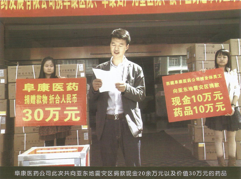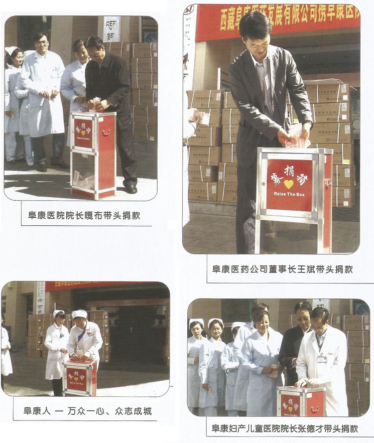 2011年9月8日,印度錫金發(fā)生了6.8級(jí)地震,地震造成了亞?wèn)|縣供水、供電、交通、通信等度全部癱瘓。災(zāi)情牽動(dòng)所有西藏人民的心,更牽動(dòng)著阜康人的心。25日,為了支援災(zāi)區(qū),阜康醫(yī)藥發(fā)展有限公司攜阜康醫(yī)院、阜康婦產(chǎn)兒童醫(yī)院以及旗下醫(yī)藥超市舉行了為亞?wèn)|地震災(zāi)區(qū)捐款儀式。在捐款現(xiàn)場(chǎng),一箱箱捐助藥品整齊地堆放在起,捐歉員工排著整齊的隊(duì)伍有序的走到捐款箱邊,把自己的捐款投入到箱中。