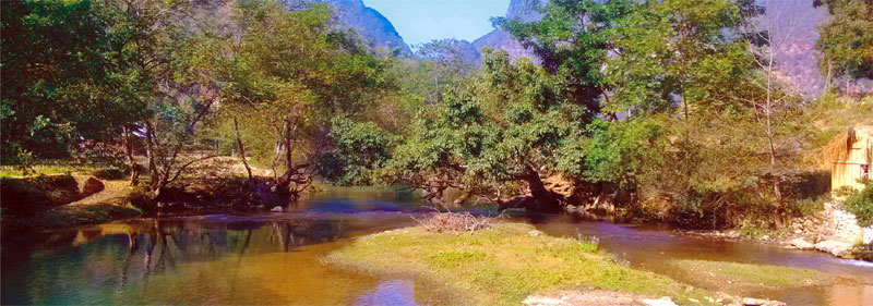 馱娘江消失在湯拿洞前,在猴爬巖洞后流經(jīng)一片崇山峻嶺環(huán)抱的平壩,又從桃源洞逝去,這個壩子就叫壩美村,一個好親熱的壯家山寨,位于云南省廣南縣八達鄉(xiāng)和阿科鄉(xiāng)之間,與廣西西林縣相鄰,一個現(xiàn)實中的世外桃源。