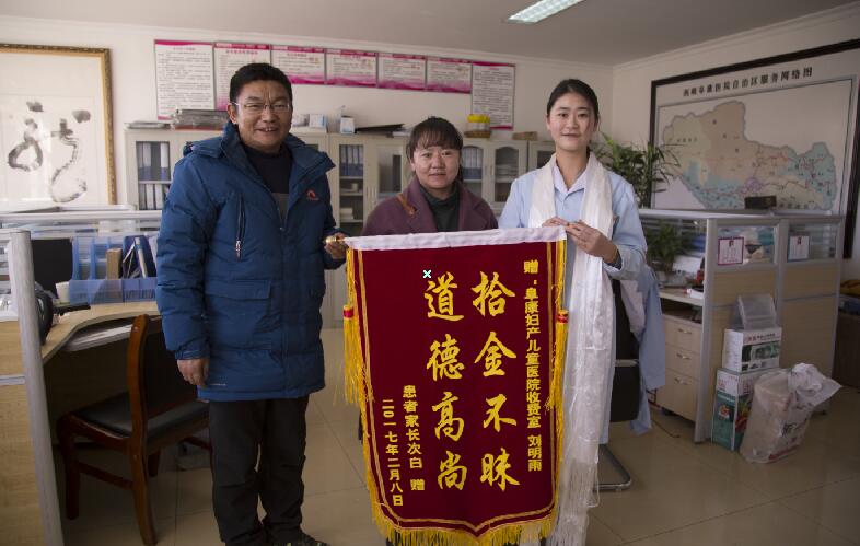 2017年2月8日上午,一對(duì)來(lái)我院就診的夫婦不慎將錢包遺落在收費(fèi)室。該科室工作人員劉明雨偶然拾到,并主動(dòng)將錢包以及錢包里的財(cái)物絲毫不差地上交了醫(yī)院辦公室。所幸,物還失主。出于對(duì)阜康婦產(chǎn)兒童醫(yī)院收費(fèi)室劉明雨同志的誠(chéng)摯感謝,2月10日下午,這對(duì)夫婦贈(zèng)送劉明雨鮮紅錦旗——拾金不昧,道德高尚!